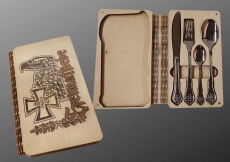 Bestehend aus einer nur für das Besteck hergestellten Holzbox mit Klappmechanismus.